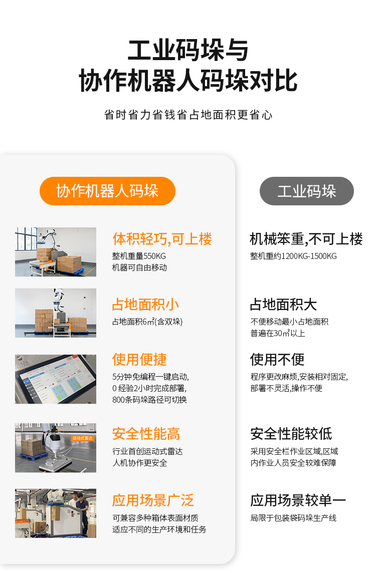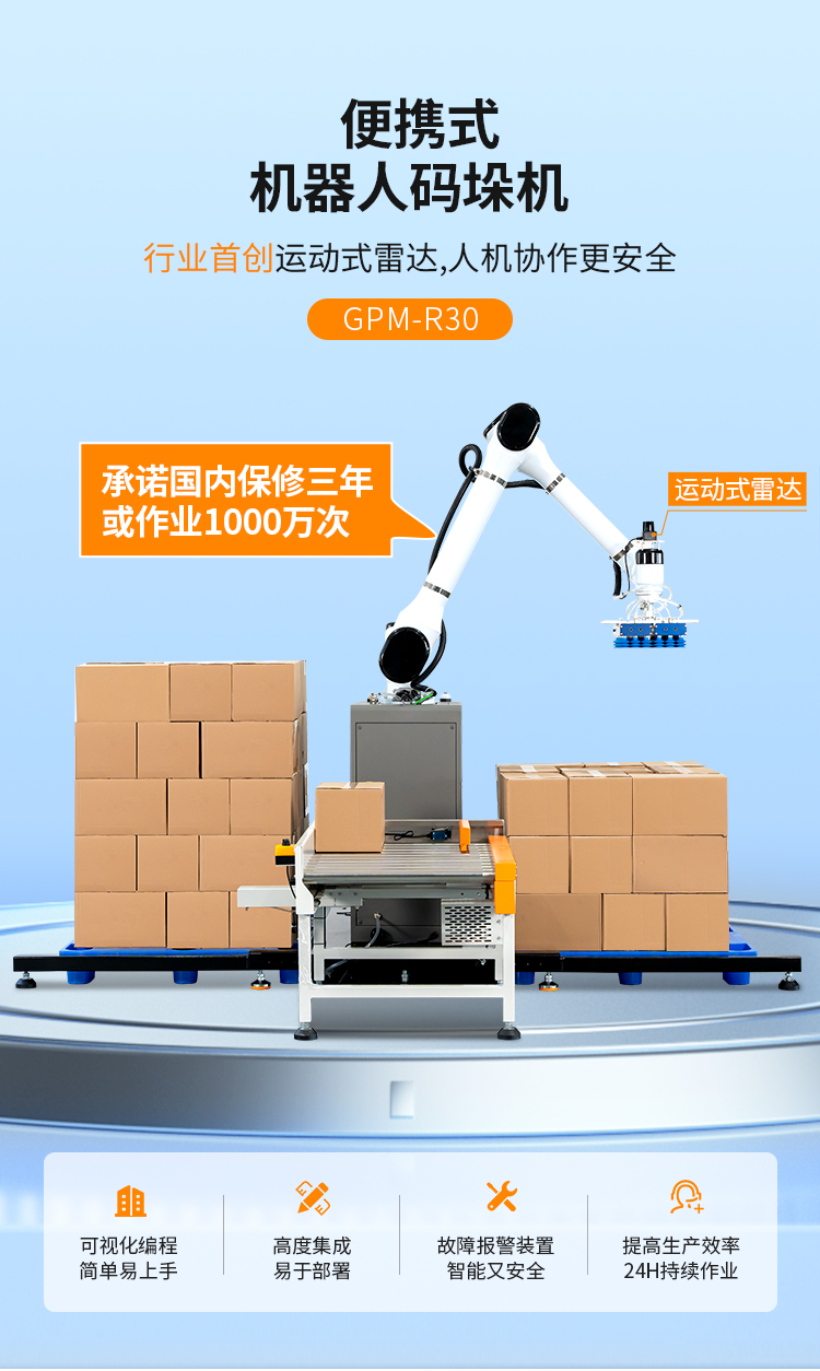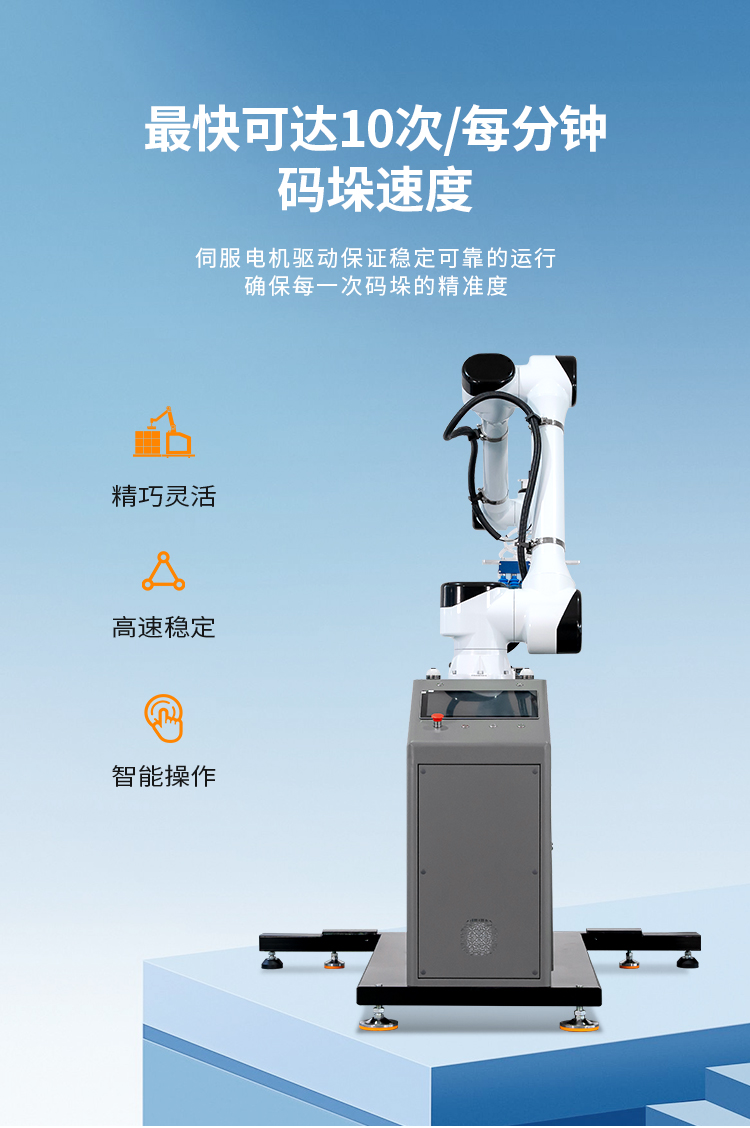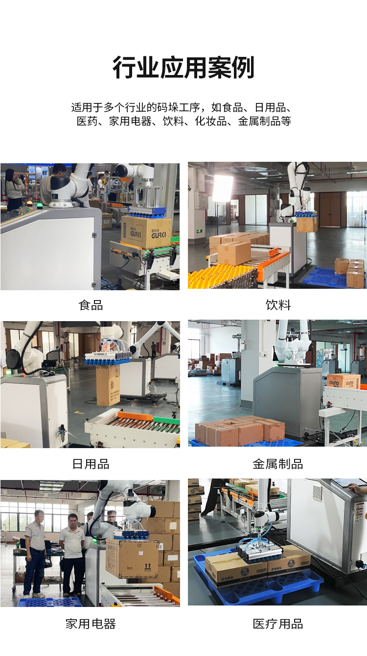 提供3年質(zhì)保或者作業(yè)1000萬(wàn)次的售后服務(wù)。協(xié)作機(jī)器人碼垛,與人類(lèi)工作人員緊密合作,提高生產(chǎn)效率、靈活適應(yīng)不同任務(wù)。安全配備傳感器,能自主學(xué)習(xí)、為工作人員創(chuàng)造更安全高效的工作環(huán)境,外形精巧美觀(guān),調(diào)整方便簡(jiǎn)單,本設(shè)備采用觸控屏操作,實(shí)現(xiàn)智能化操作管理,簡(jiǎn)便、易掌握??纱蟠蟮販p少勞動(dòng)人員和降低勞動(dòng)強(qiáng)度??瑟?dú)立使用也可配套自動(dòng)供棧機(jī)和棧板輸送機(jī)來(lái)實(shí)現(xiàn)全自動(dòng)碼垛系統(tǒng),廣泛應(yīng)用于多個(gè)行業(yè)的碼垛工序,如紙箱類(lèi)、醫(yī)藥類(lèi)、日用品、食品、飲料、化妝品、金屬制品等。